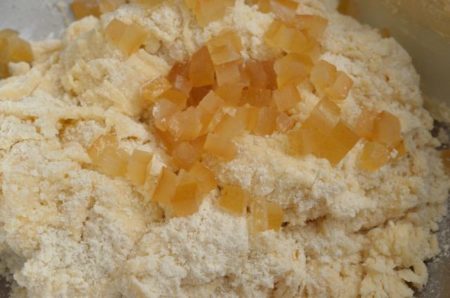 - まだ粉っぽさが残っている状態で、粗く刻んだレモンピ―ルを加えて混ぜる。