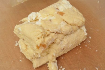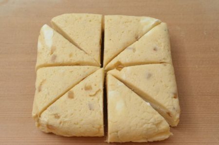 爽やかなレモンピールを加えた生地に、クリームチーズをラフに混ぜ込んだスコーン。クリームチーズのほのかな酸味、塩気、コクを生かすべく、なるべく細かくしないで塊を残すのがポイントです。レモンの香りが上品で爽やか、ふんわりしてしっかりコクもある美味しいスコーンに焼き上がりました。