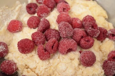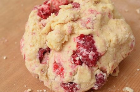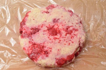 - 冷凍ラズベリーを欲張って加えすぎ、かなり扱いにくい生地になってしまいました(笑)。生地を伸ばす際にはラップで挟んで、形が整ったら即冷凍庫へ。しっかり冷やしてから切り分けます。