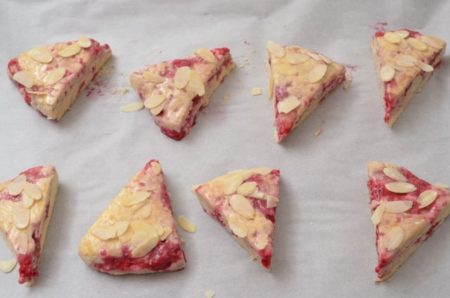 - オーブンシートを敷いた天板に並べ、表面に溶き卵を塗り、アーモンドスライスを散らす。