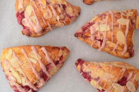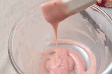 - 焼いている間に、ラズベリー・アイシングを作る。小さいボウルにラズベリージャムとレモン汁を入れて混ぜ合わせ、粉砂糖を加えてとろりと混ぜる(固ければレモン汁を加えて調整する)。