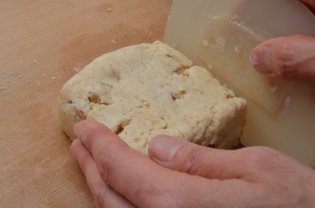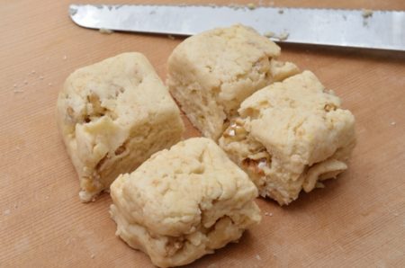 - 2.5cmの厚さ(8cm四方くらい)に生地を整え、ナイフで4等分にカットする。![]() ![]()