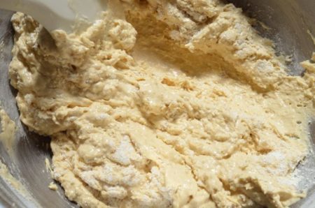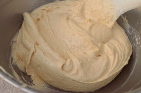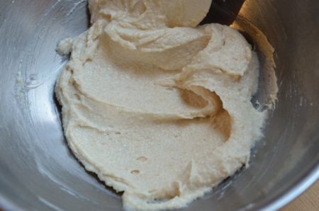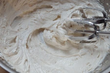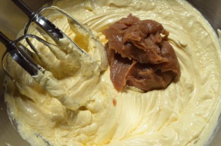 - ハンドミキサーの高速で3~4分、白っぽいふわふわのクリーム状になるまでよく泡立てる。
