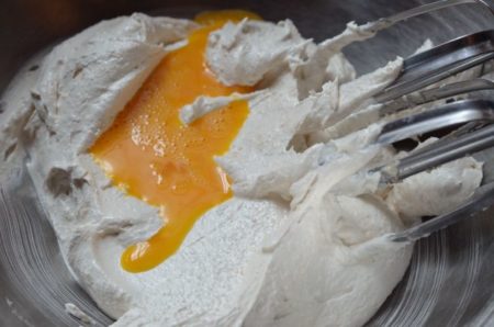 - 溶き卵を4~5回に分けて加え、そのつどハンドミキサーの高速で1~2分しっかり泡立てる。