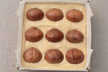 - 型に流し入れて表面をならす。栗の渋皮煮を並べ、軽く押して生地に少しだけ埋める。