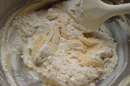- 合わせてふるっておいた薄力粉+ベーキングパウダーの1/3量を加え、ゴムベラで底からすくうようにざっくり混ぜる(粉気が残っていても大丈夫)。