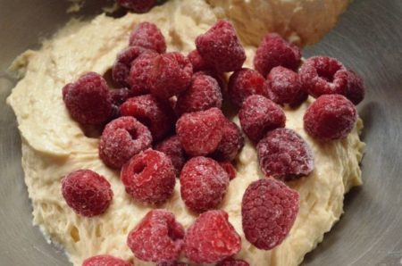 再び粉の1/3を加えて軽く混ぜ、残りの牛乳を加えて軽くなじませ、最後に残りの粉を加えたら、粉気がなくなるまで混ぜる。冷凍ラズベリーを加えてざっと混ぜ合わせる。