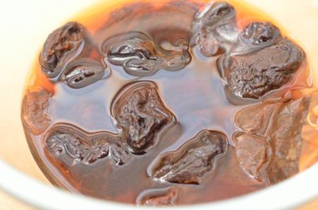 - プルーンは種を取る。熱い紅茶に浸して、ふっくらとするまで戻す(ここではアールグレイのティーバッグを2つ使った濃い紅茶で戻しています)。