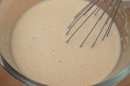 - ボウルに卵を割り入れてほぐす。砂糖を加えてすり混ぜ、薄力粉をふるい入れてぐるぐると大きく混ぜる。1の牛乳+バターを注ぎ入れて混ぜ合わせ、ラム酒も加える。