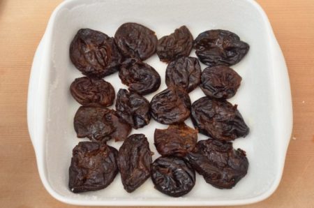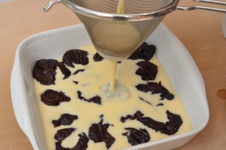 - バターを塗った耐熱皿に、汁気を切ったプルーンを並べる。
