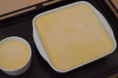 9分目くらいまで入れて生地が余ったら、小さいココットやプリン型にも注ぎ分ける。![]()