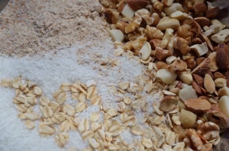 1. オートミール、薄力粉、ナッツ類をボウルに入れ、ゴムベラでよく混ぜる。