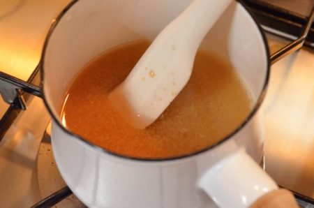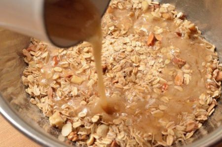 2. 小鍋に植物油、きび砂糖、はちみつ、メープルシロップ、塩を入れて中火にかける。絶えず混ぜながら加熱し、沸騰したら火からおろして1に加える。ゴムベラで全体をよく混ぜ合わせる。