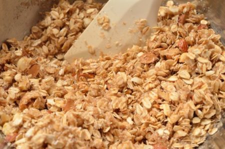 あまり食欲のない朝にもグラノーラはぴったりです。牛乳や豆乳をかけたり、ヨーグルトに混ぜたり…。アイスクリームにもよく合います。たいていつまみ過ぎてすぐになくなるので、たっぷり作ってくださいね。