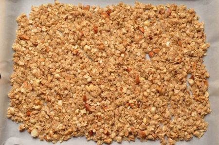 4. 160℃で15分加熱し、一旦取り出して焼きムラがないように全体を混ぜる。なるべくかたまりを大きく残すように、粗くほぐすのがポイント。再びオーブンに入れて12分~15分焼き、全体にきれいな焼き色がついたら取り出す。ドライフルーツを加えて混ぜ、天板にのせたまま完全に冷ます。