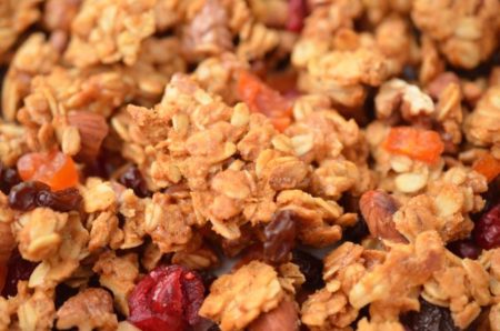 • ドライフルーツはレーズンやクランベリー、アプリコット、マンゴーなどをお好みで。水分の多いものはグラノーラが湿気やすくなるので注意、大きいものは刻んでから加えてください。