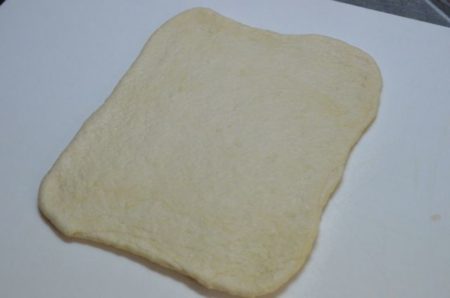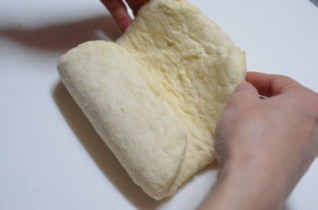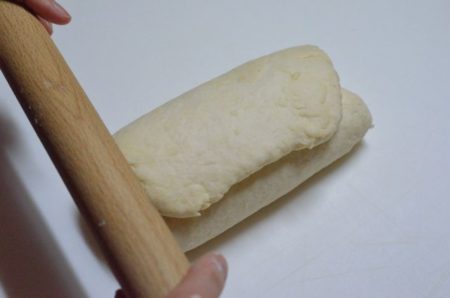 5.打ち粉をふった台に生地をのせる。めん棒でかるく伸ばし、生地を3つ折りにする。