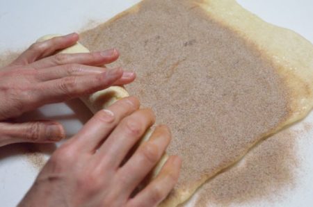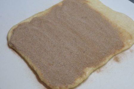 生地の向こう側の2~3cmを残して溶かしバターを塗り、混ぜておいたシナモンシュガーをふる。