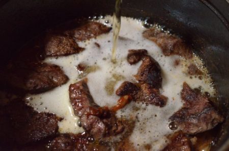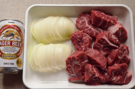 - 2に1の肉を戻し入れ、ビールを注ぎ、水をひたひたになるまで加える。