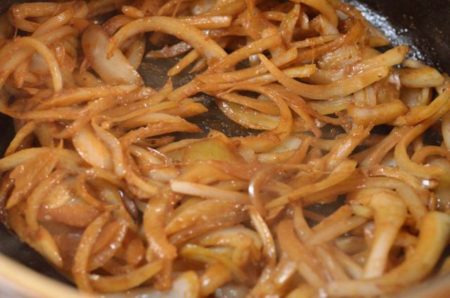 - 鍋に残った油をキッチンペーパーで軽く吸い取る。バターを入れて熱し、玉ねぎを炒める。