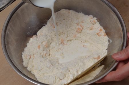 5. 牛乳を加え、カードでざっと切り混ぜるようにして生地をひとまとめにする。