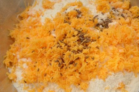 チェダーチーズの分量は60gに変更。チーズおろし器ですりおろし、上記の作り方と同じタイミングで加える。ここではアクセントにクミンシードを小さじ1をプラス。