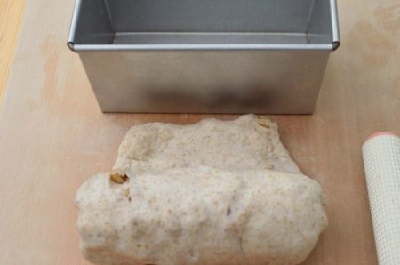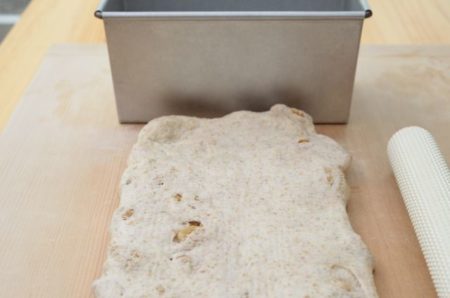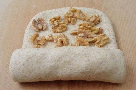4. 生地をめん棒で伸ばして、くるみの2/3量を巻きこむ。生地をの向きを90度変え、めん棒でさらに伸ばす。残りのくるみを巻き込む。