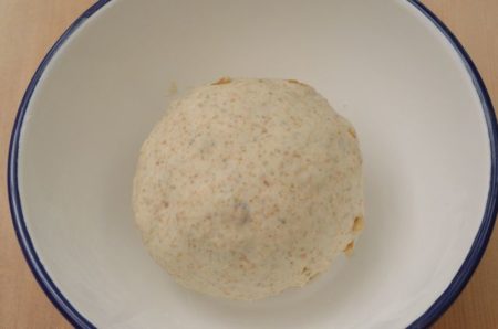 5. 表面を張らせるように丸くまとめ、ボウルに入れる。ラップをかけて、1次発酵させる。目安は生地が1.5倍~2倍に膨らむまで。25℃の室温で5時間ほど。写真は直径20cmのボウルを使用。
