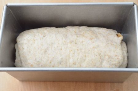 9. 温かいところで2次発酵させる。型下3~4cmくらいに生地が膨らむまで。35℃~40℃で1時間強が目安(オーブンの発酵機能を使うと便利)。