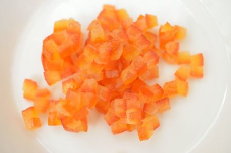 - アプリコットの甘煮を作る。小鍋にドライアプリコットとひたひたの水を入れ、中火に5分ほどかける。あんずが柔らかくなったら、グラニュー糖を加えて2~3分煮て火から下ろし、そのまま冷ます。80g分を取って汁気を切り、粗く刻む。