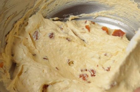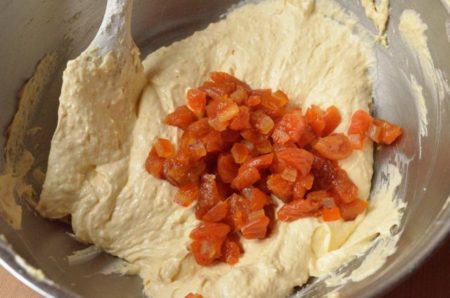 - 粉っぽさがなくなったらドライアプリコットの甘煮とオレンジピールを加える。