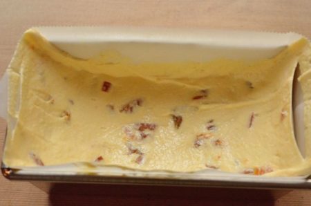 - 型に生地を入れ、型を数回持ち上げて落とし、生地の中の余分な空気を抜く。ゴムベラで中央をへこませるように表面をならす。