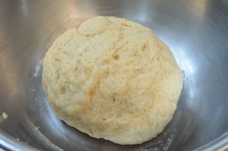 - 本ごねの材料のⒶとⒷ、1の中種を合わせ、生地がまとまるまで3~5分間こねる(こね上がりはボソボソした状態でよい)。