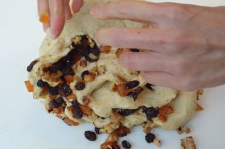 - 3の生地を広げてⒸをのせてたたむようにしてこね、生地にフルーツとナッツ類が均等に混ざるようにする(べたつくので打ち粉をして手早く作業する)。