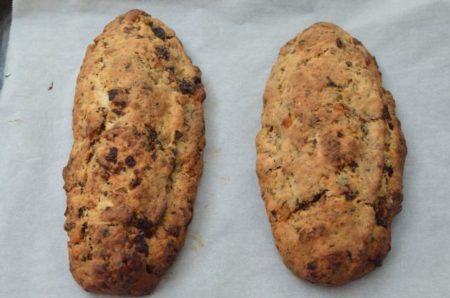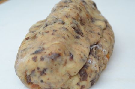 ドライフルーツ&ナッツのフィリングとバターがたっぷりの生地なので、中種法で発酵力を高めています。それでもあまり膨らまないのですが、心配いりません。レシピは細かいですが、作るのは大雑把で大丈夫。今回もレーズン(長年漬けっぱなしのもの)が練り込むうちにぐちゃぐちゃになり、生地は最後までベタベタでしたが、出来上がりは例年通り、絶品シュトーレン!