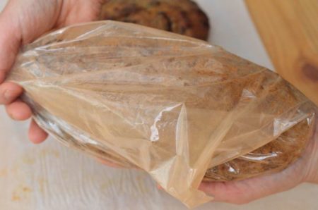 手前側の山を向こう側の山に重ねるようにして折りたたむ(向こう側の端が1cmほど出るように折る)。手で全体を押し固めるようにして形を整える(成型後の2次発酵も不要)。![]()