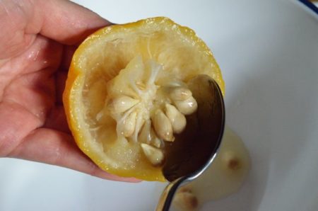 柚子を縦半分に切って、とろとろの中身をかき出して、ボウルに入れます。