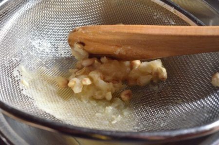 とろとろをザルに入れて、木べらで押し付けるようにしてこし出します。ザルに残った種や筋は捨てます。