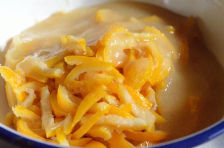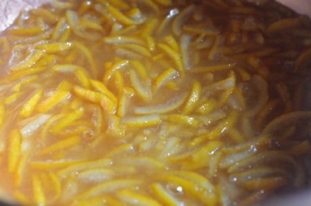 皮は白い部分を少し削いで、4~5mm幅に刻みます。こし汁と合わせて重さを量り、50%のグラニュー糖と水(1/2~1カップ)と一緒に鍋に入れます。