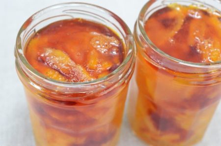 キャラメルソースは、小鍋にグラニュー糖大さじ3+水大さじ1をを入れて火にかけます。きつね色に焦げたら火から下ろし、お湯大さじ1+1/2を加え、沸騰がおさまったら、瓶に入れたマーマレードに注ぎ入れます。