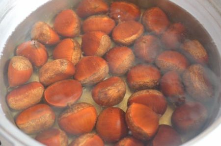 - 栗はさっと洗ってから鍋に入れ、たっぷりの水を加えて強めの中火にかける。沸騰したら弱火にして、30~40分ほど栗を茹でる。火から下ろして、そのまま粗熱を取る。