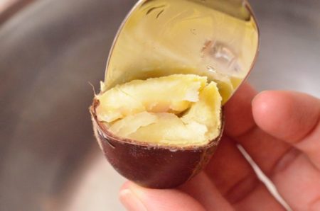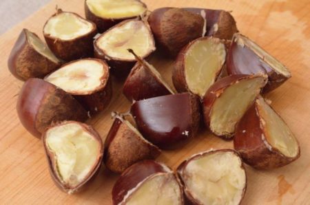 - 鍋に手が入るくらいまで冷めたら栗を取り出し、半分に切る。
