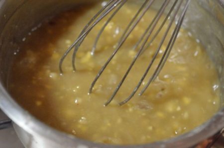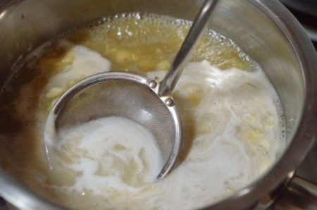 アクが出なくなったら泡立て器で大きく混ぜながら、さらに5分ほど煮詰める。