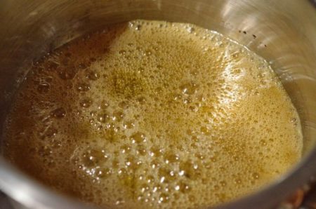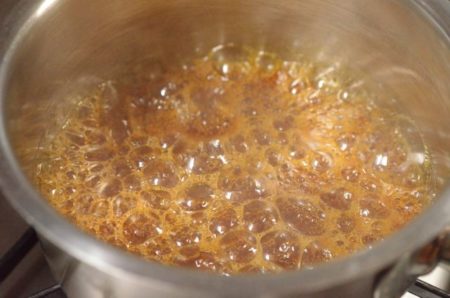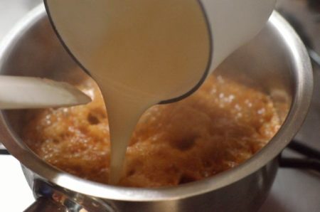 - 別の小鍋にグラニュー糖と水を入れ、強めの中火にかける。しばらくはいじらず、縁から泡立って茶色くなってきたら鍋を大きく回しながら均一にする。