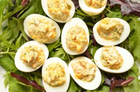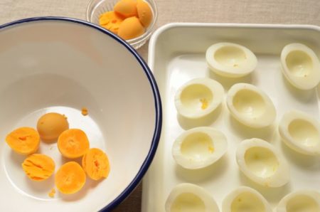 - 卵は固ゆでにして殻をむき、縦半分に切って白身と黄身に分けておく。