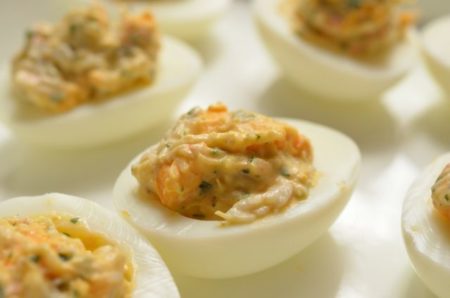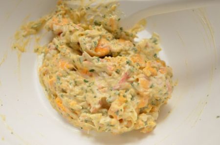- ボウルに黄身3個分、カニ肉、パセリを入れてマヨネーズで和え、塩、こしょうで味を調える。