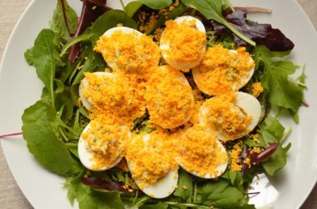 花屋さんでミモザを見かける季節になりました。春の訪れを告げるミモザは、鮮やかな黄色が目をひく可憐な花。そんなミモザのように、食卓をパッと明るくしてくれるサラダを作ります。卵の黄身をミモザに見立てたウフ・ミモザ(ウフはフランス語で卵)を、たっぷりのベビーリーフの上に並べるだけ。とても簡単で、華やかで楽しい雰囲気のある一皿です。