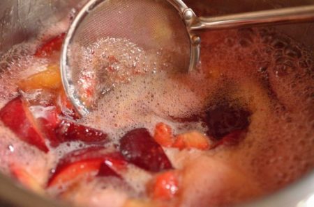 - プラムをよく洗い、皮はむかずに適当な大きさにカットする。種は周りの果肉を付けたまま使う。